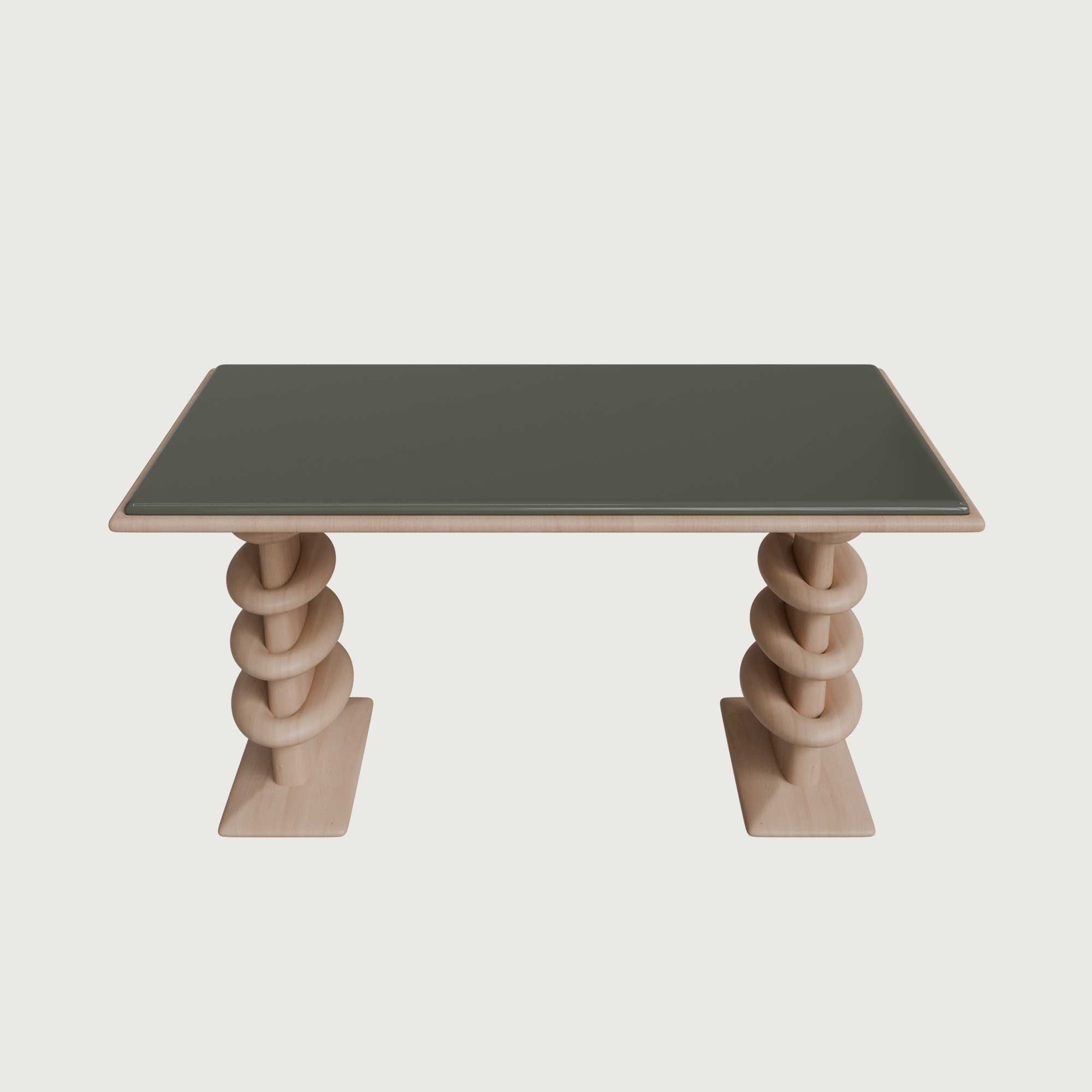 Подстолье выполнено в виде ритмично наслаивающихся округлых форм, будто нанизанных друг на друга, как воспоминания, складывающиеся в историю. Эта конструкция вызывает ощущение игры, движения и визуальной энергии. Благодаря такому архитектурному приёму стол воспринимается не просто как предмет мебели, а как арт- объект.