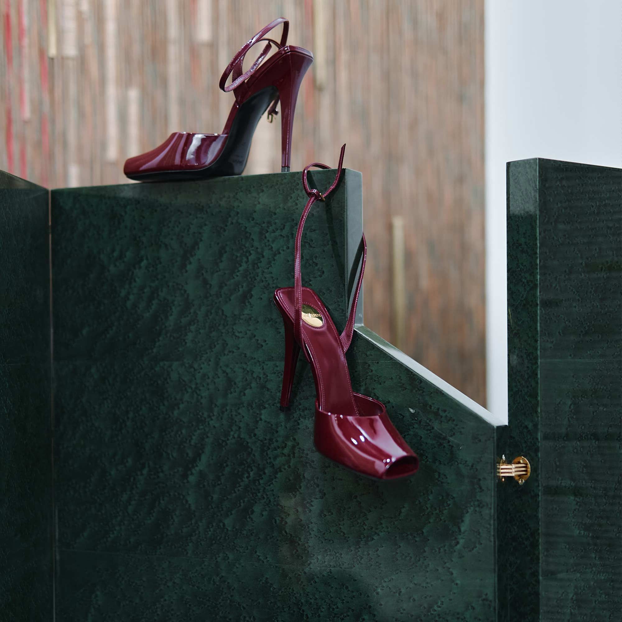 Глянцевая поверхность подчеркивает монолитность силуэта, а утончённые латунные петли становятся элегантным акцентом. Графичная, почти архитектурная форма придаёт ширме скульптурное звучание, позволяя ей органично существовать в интерьерах — от современного минимализма до арт-деко.